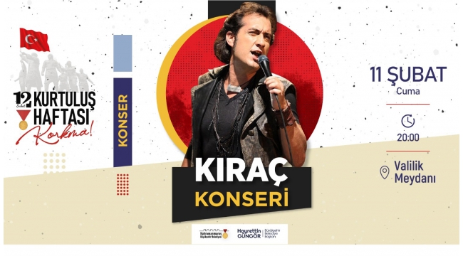 Gerçekleştirilecek etkinlik ile ilgili Kültür Spor ve Turizm Dairesi Başkanlığı tarafından yapılan açıklamada, “Kurtuluş Haftası etkinliklerimiz tüm hızıyla devam ediyor. Program kapsamında 11 Şubat Cuma günü 20.00’da Kıraç konseri düzenliyoruz. Valilik Meydanı’nda gerçekleştirilecek konser öncesi oyuncuları arasında Tamer Karadağlı’nın da yer aldığı ‘Kurtuluş Destanı’ tiyatrosunun gösterimi yapılacak. Programımıza tüm hemşehrilerimiz davetlidir” ifadeleri kullanıldı.